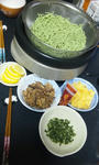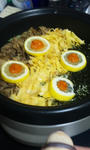 茶そばをホットプレートで焼いて、上に肉(本来は牛バラらしいけど今回は豚バラ&椎茸)、錦糸卵、海苔を乗せ、レモンの輪切り&モミジおろしを配置したらできあがり(≧∇≦)