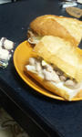 バゲットに玉葱とチキンと卵。