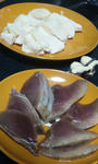 カツオの刺身と蒸し鶏肉。