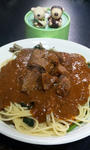 付け合わせの野菜をパスタと絡めて肉は細かくして乗せてみた。(四枚目)
